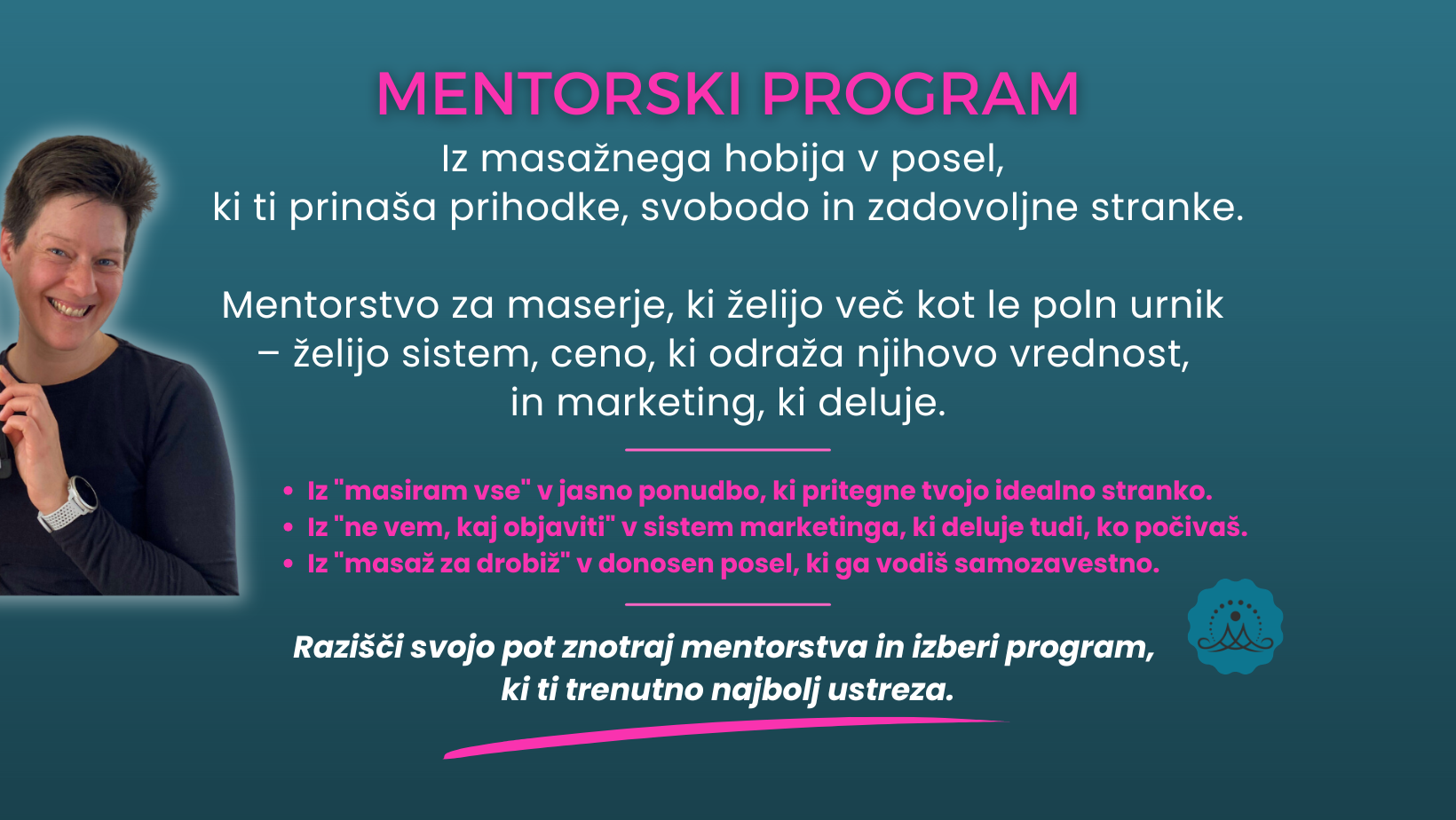 Zato sem ustvarila Mentorski program za masažni posel, da tudi ti prideš do tega – prej, hitreje in lažje kot jaz.